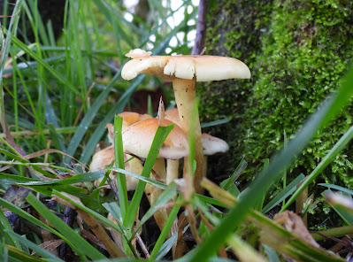 Our feeding station is up and running now at our good friend's farm near Nateby, and we are just topping it up about every 6 - 7 days at the moment. Tree Sparrows, Greenfinches, Goldfinches, Chaffinches, Blue, Great, and Coal Tits are all busily feeding away. On one of our visits we had a flock of 180 Golden Plovers fly over heading south, and it made me think that Golden Plovers always seem to be in a hurry! In a field gateway in the bottom of the hedge we came across some Sulphur Tuft fungi, but it was past its best.